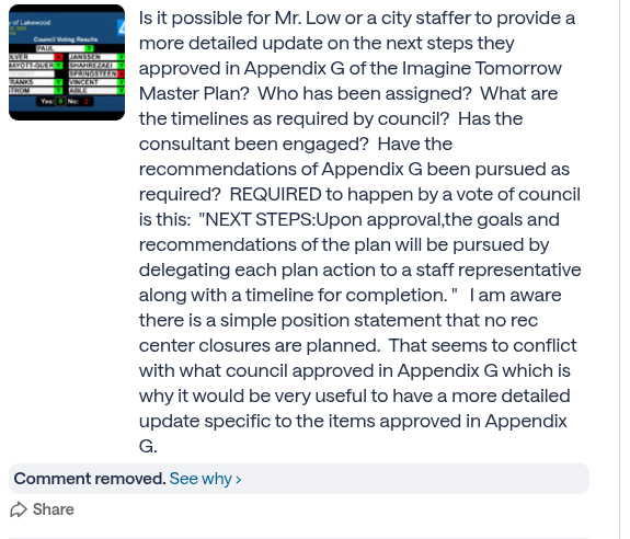 For added context, various members of city hall had also been posting on Nextdoor that some people were spreading ‘rumors’ and ‘misinformation’ regarding possible rec center closures. Although, the proposal to explore closing rec centers is clearly documented in City Council’s own master plan for Lakewood. So simply quoting from that master plan risks being labeled by city hall as spreading ‘rumors’. Simply trying to get the Ward 3 council rep to admit what is in the master plan resulted in the comment being banned and the Nextdoor account being suspended!
