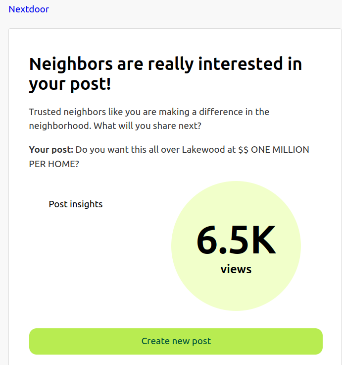 The 13 posts that have been BANNED from Nextdoor received at least 20,000 to 30,000 views. One post received over 6,000 views! They also received hundreds of comments and hundreds more positive reaction icons from readers. The author challenged the bans but without success so far.